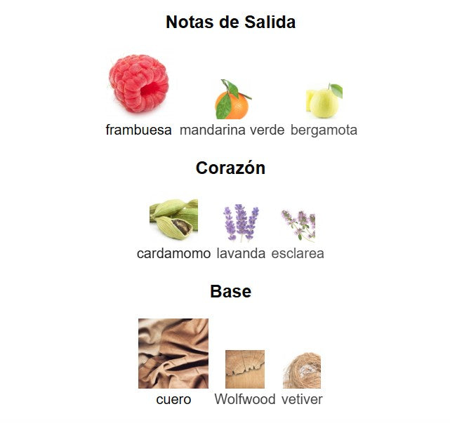 Una fragancia masculina intensa y sofisticada que inicia con notas vibrantes de frambuesa madura, mandarina verde y bergamota, seguidas de un corazón especiado de cardamomo y lavanda, y culmina con una base lujosa de acorde de cuero y vetiver. Este perfume ofrece una estela duradera y una proyección notable, ideal para noches especiales o climas fríos. Su composición equilibrada entre dulzura, especias y maderas lo convierte en una opción versátil para hombres que buscan una fragancia distintiva y elegante.