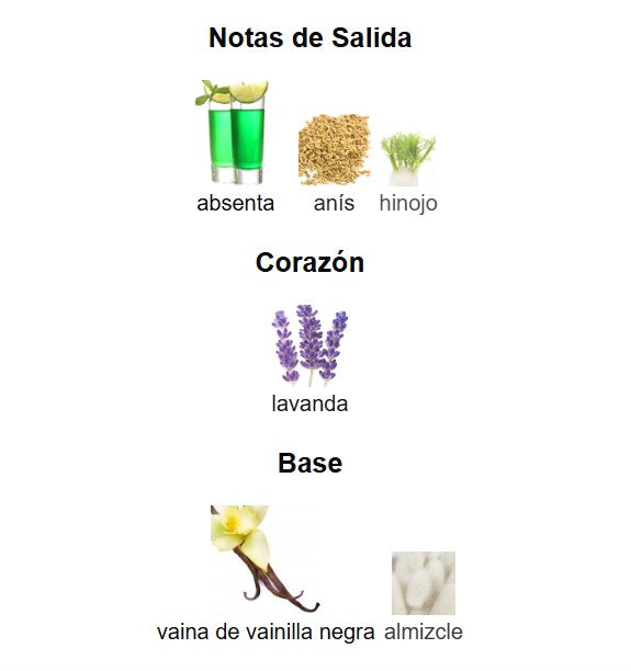 Una fragancia intensa y seductora que combina notas de absenta, anís y hinojo en su salida, seguida de lavanda en el corazón y una base cálida de vainilla negra y almizcle. Ideal para noches especiales y ocasiones donde quieras destacar con un aroma único y sofisticado.