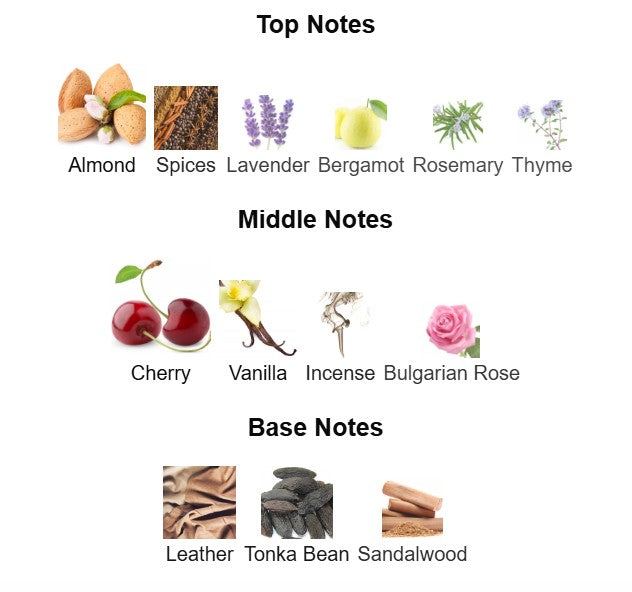 Una fragancia cálida, seductora y sofisticada que mezcla almendra cremosa, vainilla, cereza e incienso sobre una base elegante de cuero y sándalo; ideal para hombres seguros y con estilo, perfecta para climas fríos, citas o noches especiales, con excelente duración y proyección equilibrada.