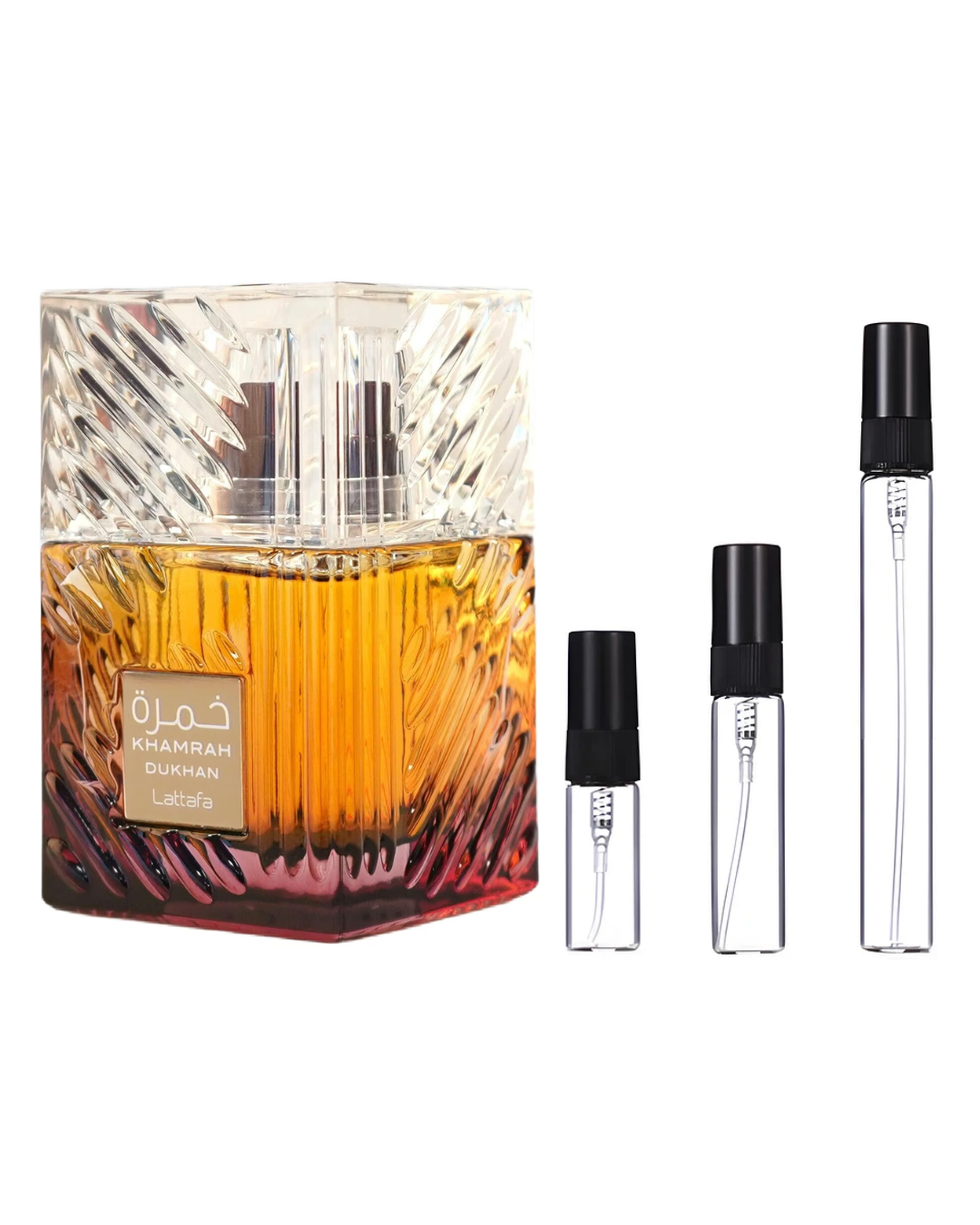 Khamrah Dukhan es una fragancia intensa y sofisticada que lanza una mezcla especiada de mandarina, pimentón y especias ahumadas, evolucionando hacia un corazón de incienso, cistus, azahar y pachulí, y culmina con una base adictiva de tabaco, ámbar, praliné, benjuí y haba tonka; su carácter gourmet-ámbar ahumado es ideal para hombres que buscan presencia y elegancia en climas fríos o para salidas especiales, con excelente duración y una estela poderosa y misteriosa.