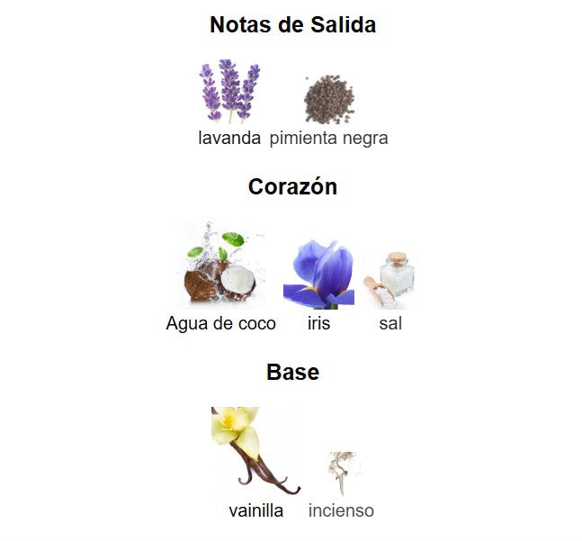 Fresco y especiado al inicio, con un corazón cremoso de coco e iris y un toque salado que recuerda la brisa marina. Termina cálido y dulce con vainilla e incienso. Perfecto para usar en climas cálidos con estilo.